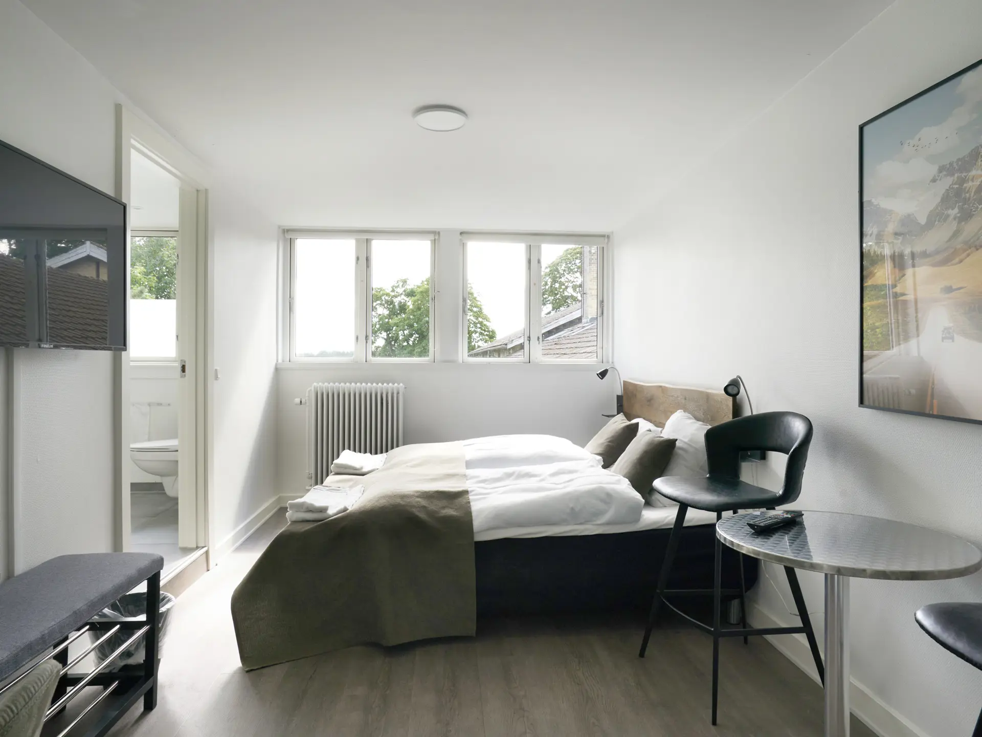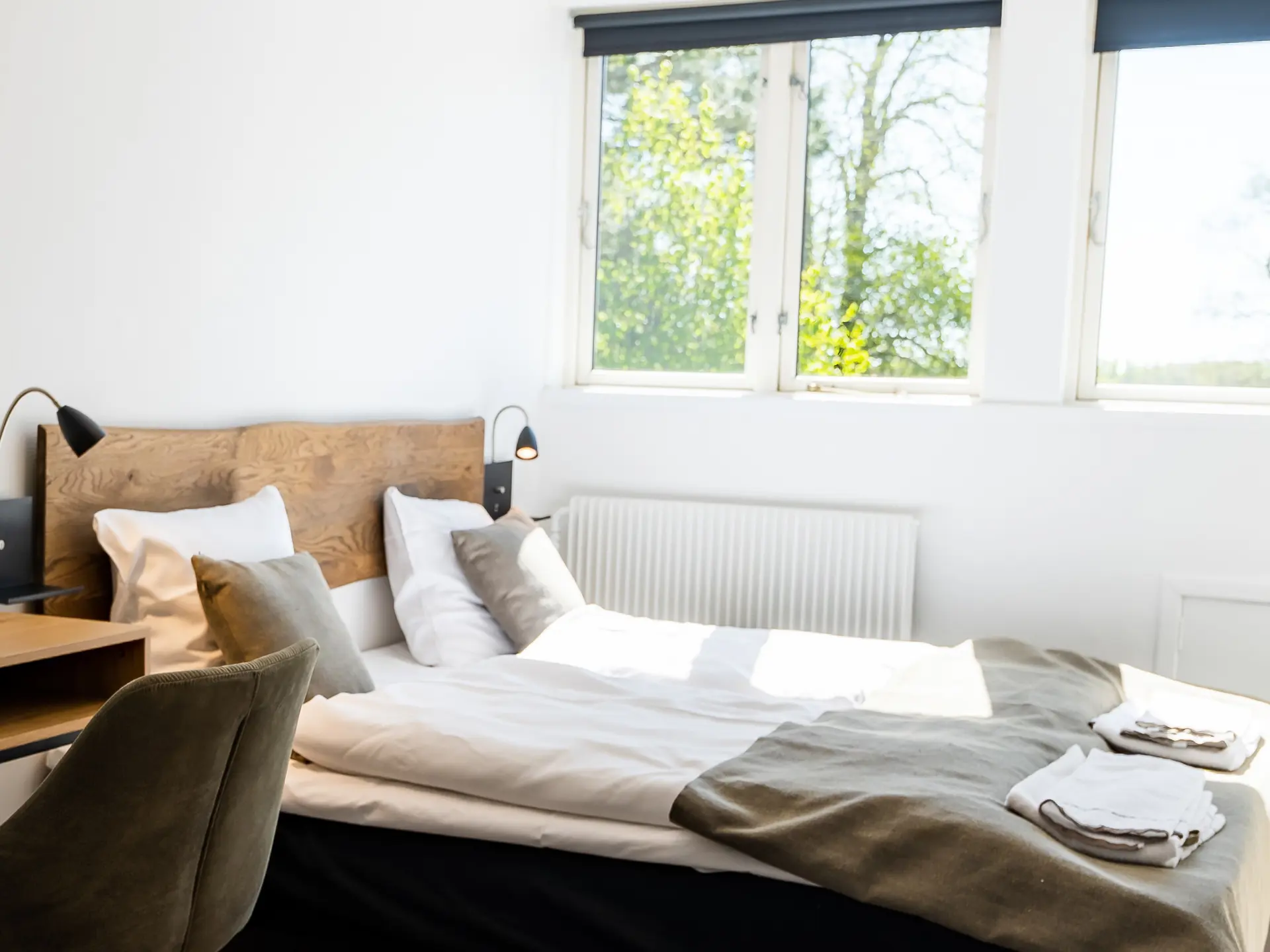 Hotel Skanderborghus råder over 55 individuelt indrettede hotelværelser. Alle værelserne har eget toilet og bad, fladskærms-tv og pragtfuld udsigt over skoven eller søen. Der er gratis trådløst internet overalt på hotellet, og der er gratis parkering uden for hotellet. Værtspar: Britt og Claus Slott.