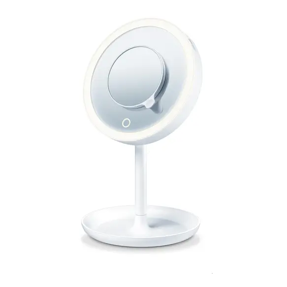 Det 5 x forstørrende spejl kan opbevares bag på det store spejl, når det ikke er i brug. Når du skal bruge det forstørrende spejl, placeres blot på midten af det store spejl, hvor det hænger fast med magnetisk kraft. BS 45 leverer en imponerende lysstyrke med 28 skarpe LED lys drevet af 3 x AA batterier. Farvetemperaturen på lyset er perfekt til makeuplægning, og det stærke ringlys oplyser ansigtet så det bliver nemmere at se, om concealeren er blendet perfekt ind i huden. Lyset hjælper også med at opdage de små hår, når man skal plukke øjenbryn.