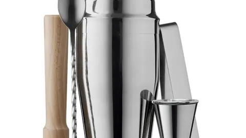 Lækkert barsæt i rustfrit stål og bøgetræ. Sættet indeholder 700 ml shaker, 19,5 cm røreske, 2/4 cl dobbelt målebæger og istang i rustfrit stål samt 15,6 cm støder i bøgetræ. Ståldelene kan vaskes i opvaskemaskine, mens støderen skal håndopvaskes.