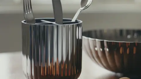 Bestikholderen er fremstillet i blankt rustfrit stål og har en praktisk bund i TPE, der sikrer stabilitet. Den rummer op til seks bestiksæt – perfekt til både hverdagsbrug og gæster.
