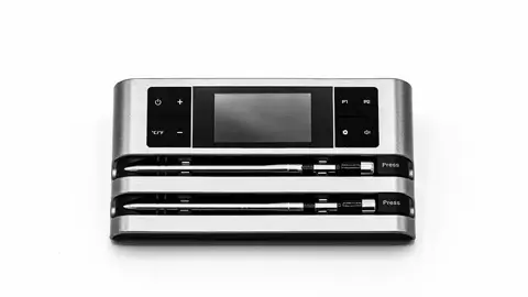 Få fuld kontrol over din grill eller ovn med dette smarte sæt fra hâws BBQ. Her får du to separate stegetermometre med dobbeltsensor, så du kan måle både kernetemperaturen i kødet og temperaturen i grillen eller ovnen – helt samtidig.