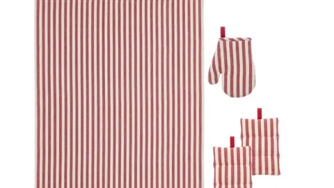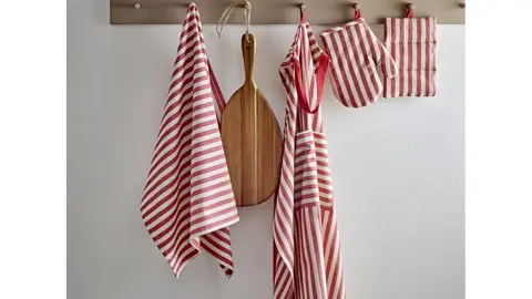 De elegante striber giver et tidløst udtryk, der passer ind i alle køkkener, mens materialet i genanvendt bomuld gør sættet til et mere bæredygtigt valg i hverdagen.